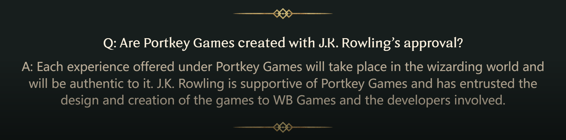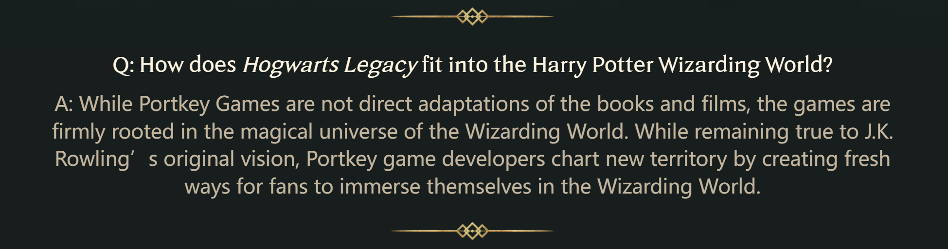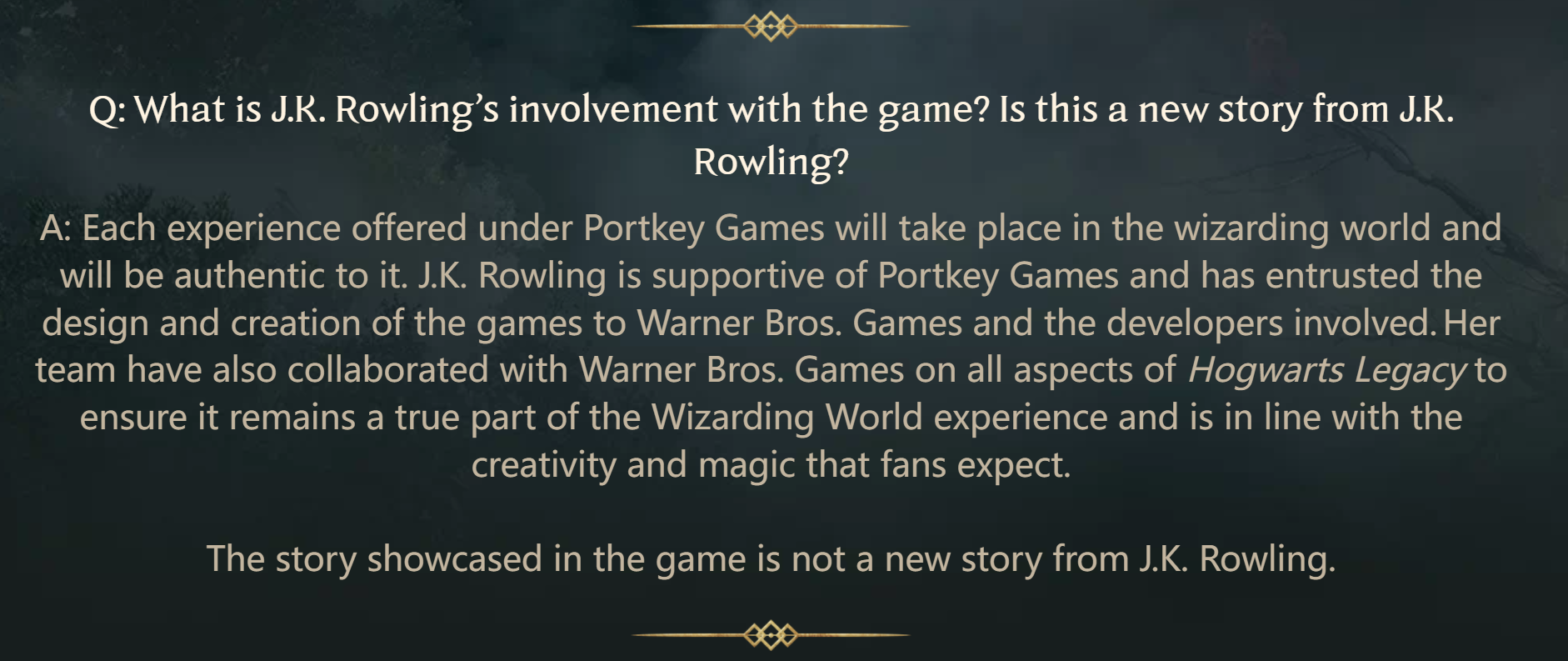 回答:Portkey Games提供的每种体验都将于魔法世界中进行,并忠于魔法世界。J.K.罗琳支持Portkey Games,并已将游戏的设计及创作委托给WB Games及相关开发商。她的团队还与 Warner Bros. Games针对【霍格沃茨:遗产】的各个方面有所合作,以确保其仍为魔法世界体验的真正组成部分,并符合粉丝所期望的创造力和魔力。游戏中呈现的故事并非J.K.罗琳编写的新故事。