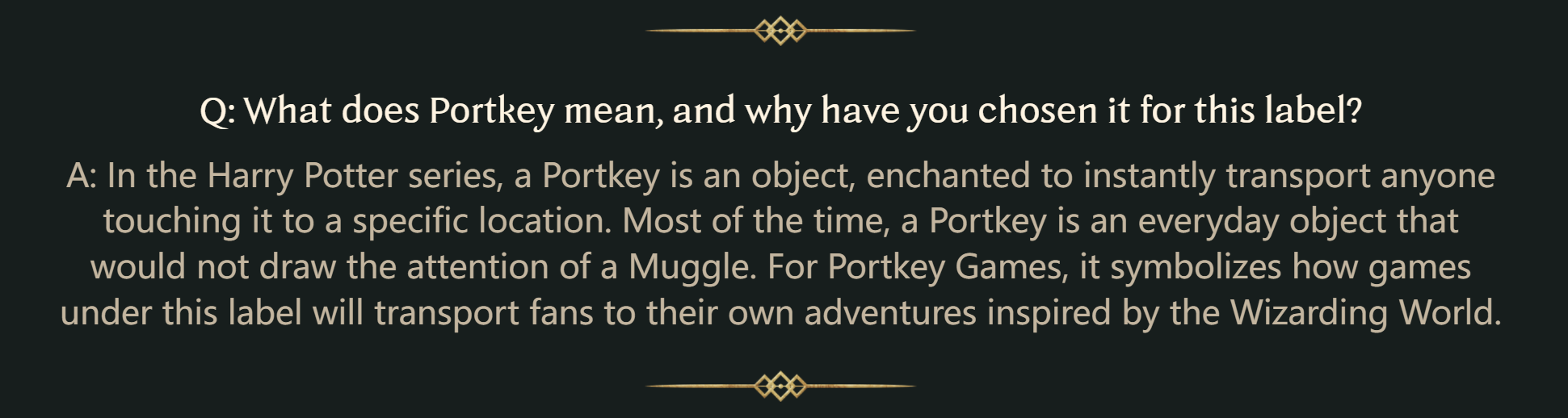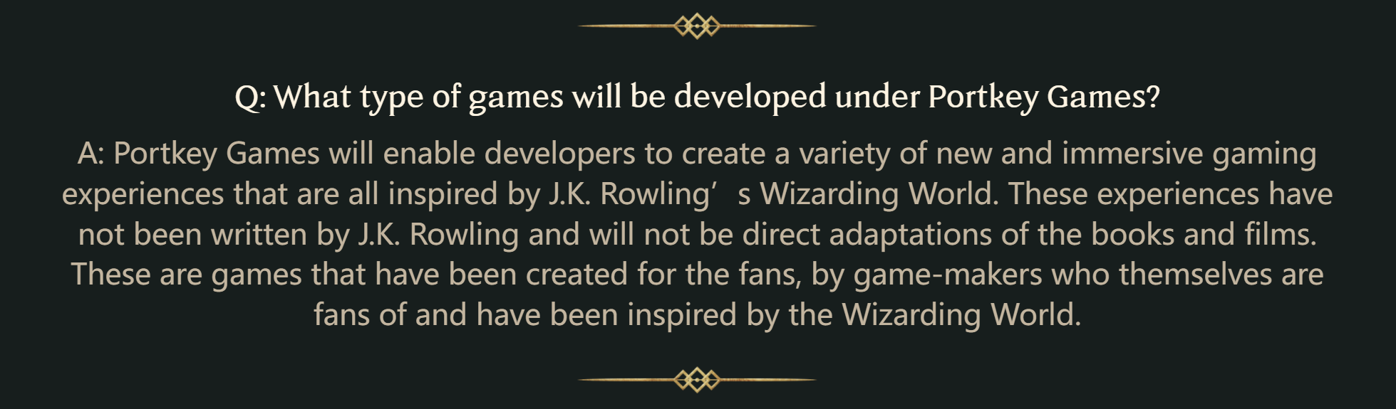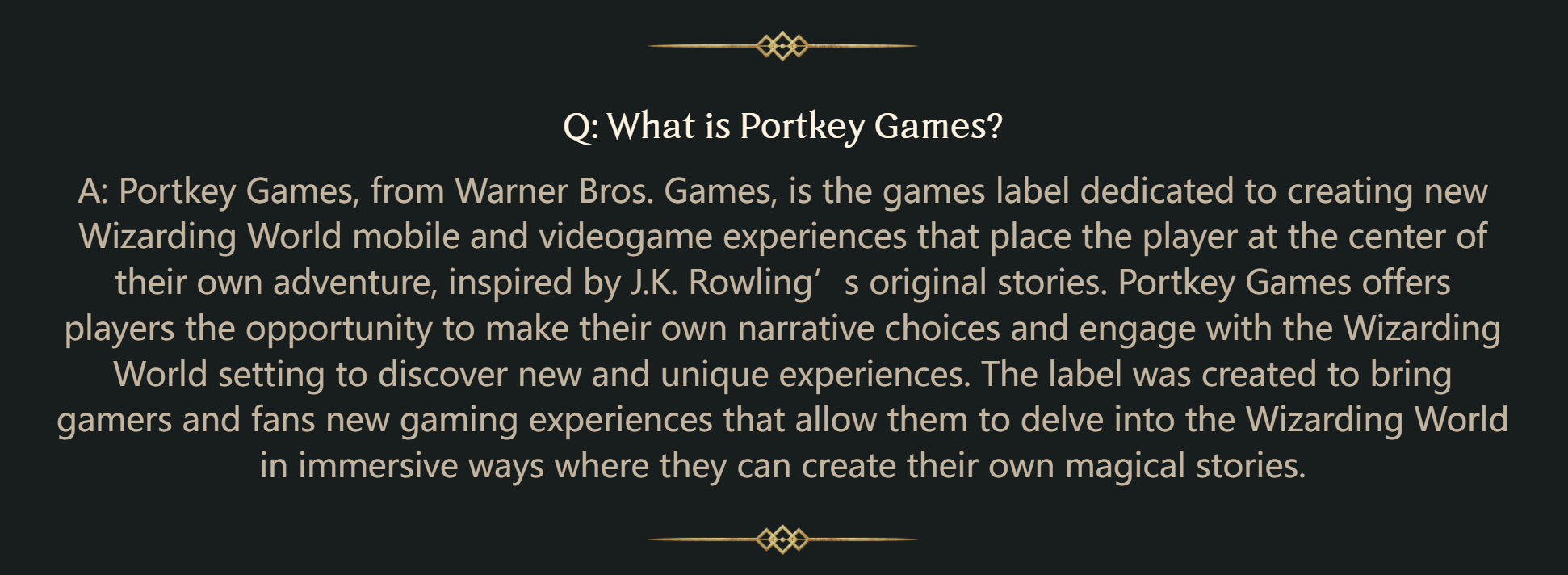 回答:Portkey Games提供的每种体验都将于魔法世界中进行,并忠于魔法世界。J.K.罗琳支持Portkey Games,并已将游戏的设计及创作委托给WB Games及相关开发商。她的团队还与 Warner Bros. Games针对【霍格沃茨:遗产】的各个方面有所合作,以确保其仍为魔法世界体验的真正组成部分,并符合粉丝所期望的创造力和魔力。游戏中呈现的故事并非J.K.罗琳编写的新故事。
