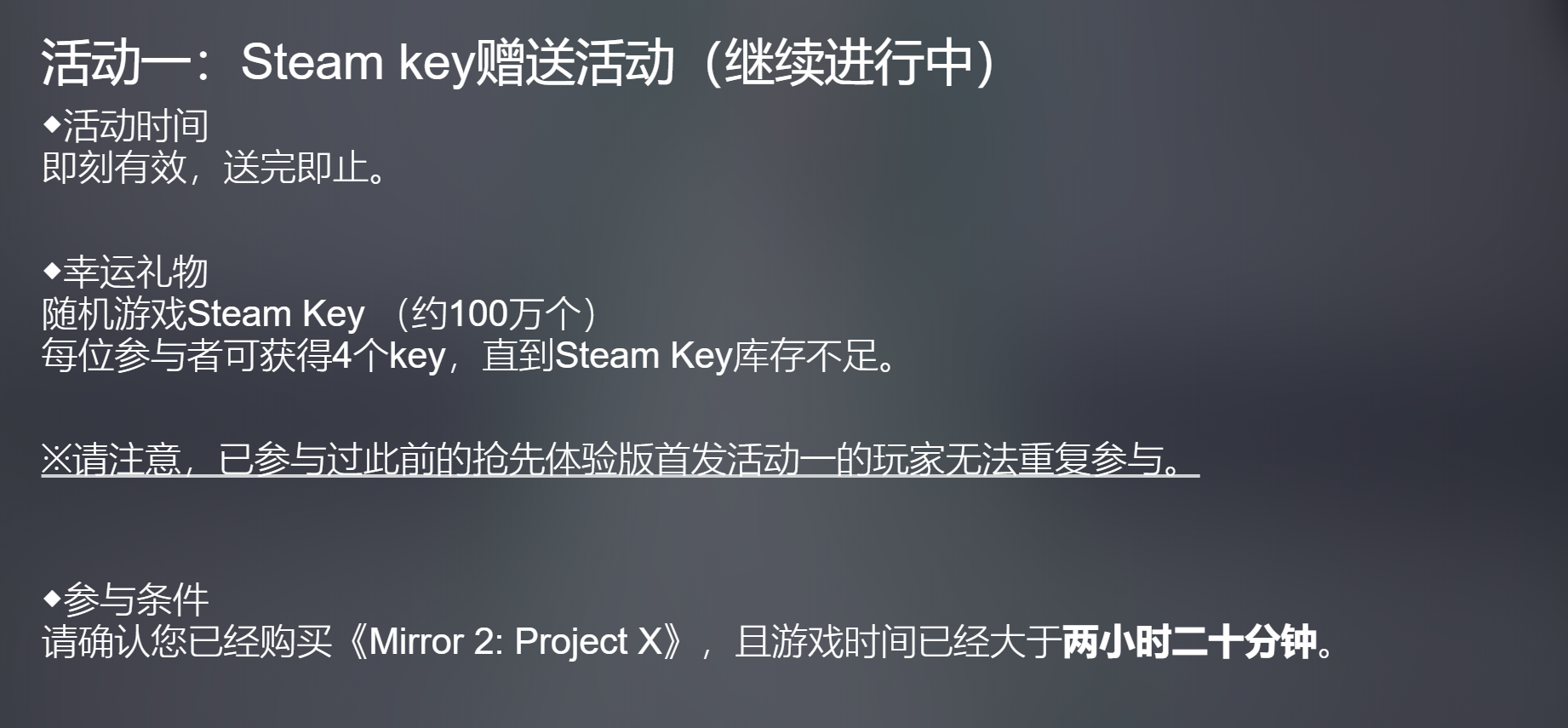 【Mirror2】活动又双叒叕续了一轮,可以在Steam中下载【Mirror News Center】或直接从下方链接参与活动。