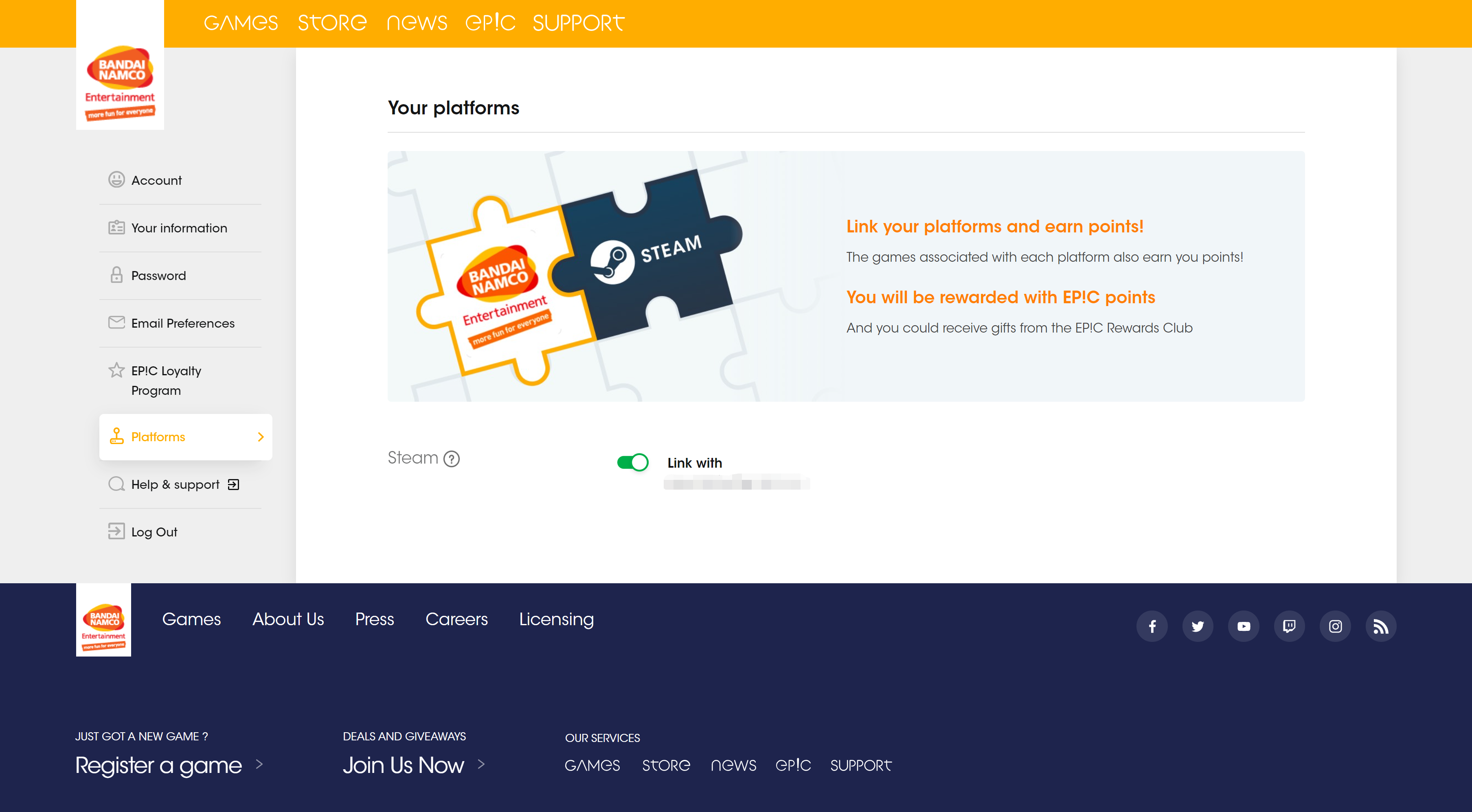 2. 关联Steam账号:https://account.bandainamcoent.eu/platforms