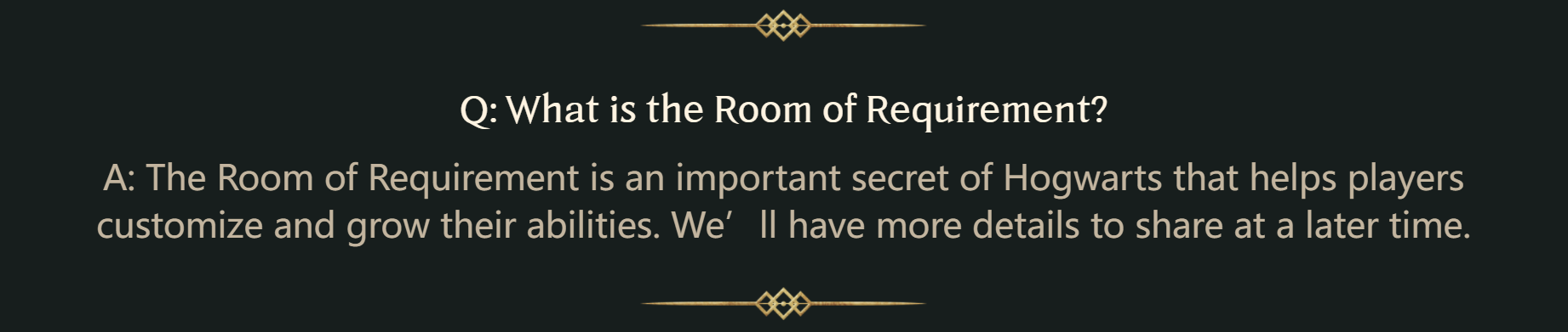 回答:有求必应屋是霍格沃茨重要的秘密,可协助玩家自订及提升技能。我们会在之后分享更多细节。