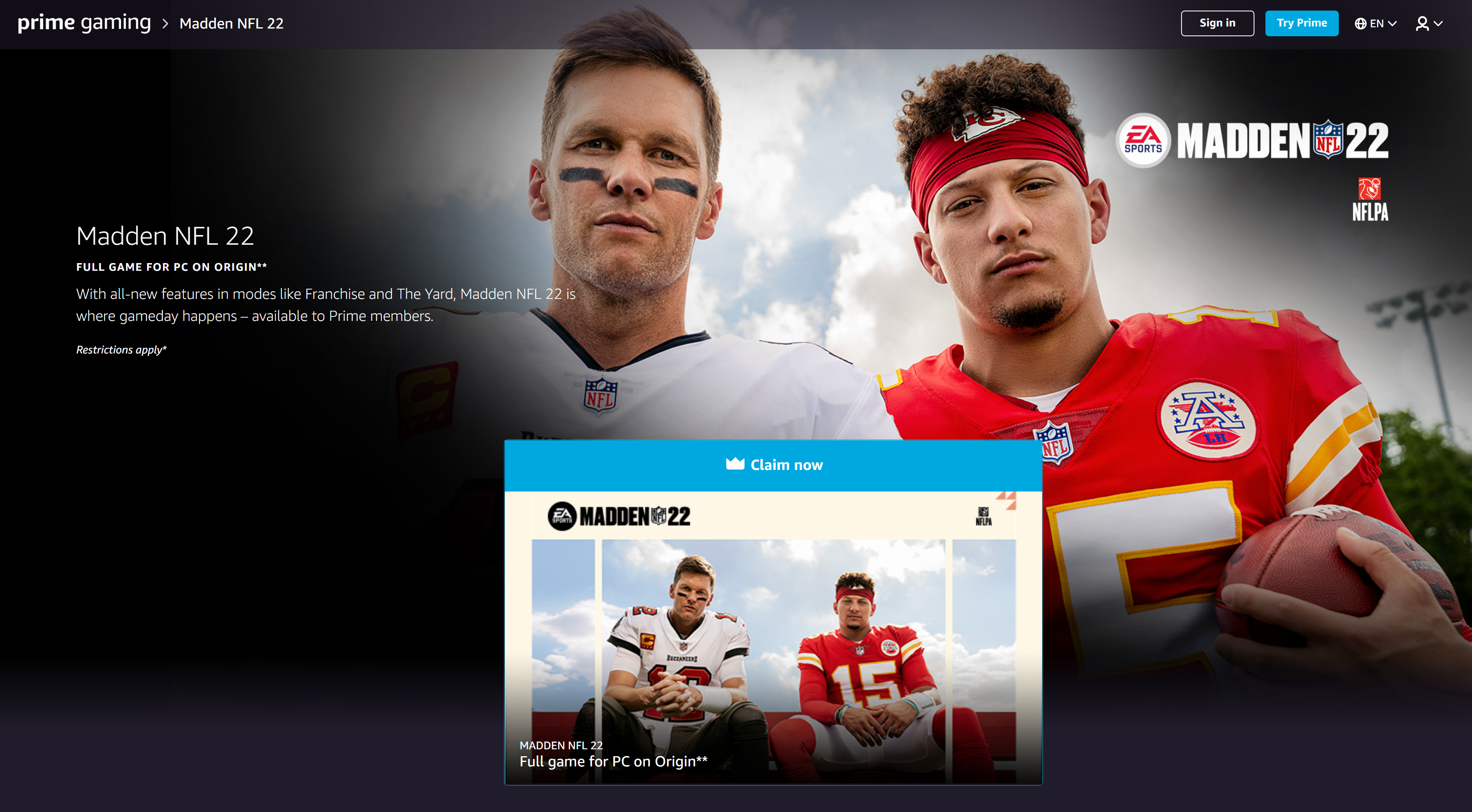 Amazon Prime Gaming可以免费领取【麦登橄榄球22】Origin平台激活码,可以使用30天的Prime免费试用期领取,之后记得取消订阅避免收费。(美区)