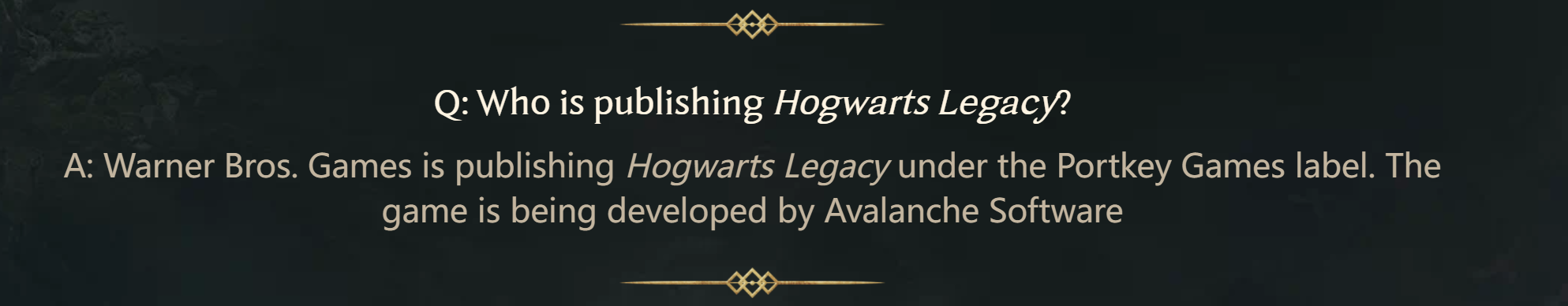 回答:Warner Bros. Games将以Portkey Games品牌发行【霍格沃茨:遗产】。此游戏由 Avalanche Software开发。