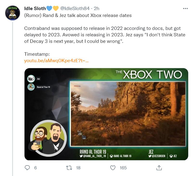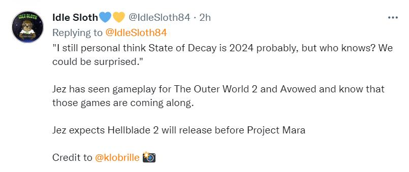 Jez表示,由黑曜石娱乐开发的新游戏《宣誓》将会在2023年推出;至于《腐烂国度3》,他不认为能在2023年发布,他认为更可能是2024年发售,不过他也有可能搞错了。