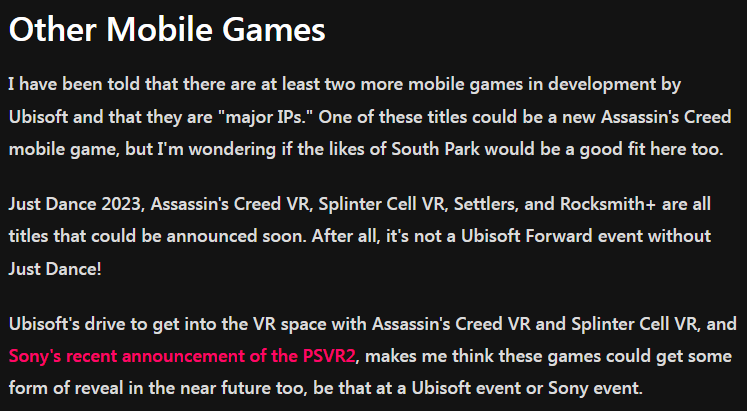 知名业内人士Tom Henderson今天发布了许多育碧游戏的爆料,让育碧boy大饱眼福。据他的消息,《舞力全开2023》、《刺客信条VR》、《细胞分裂VR》、《工人物语》和《摇滚史密斯+》都是即将发布的游戏。考虑到索尼最近公布的PlayStation VR2,Tom Henderson预测《刺客信条VR》和《细胞分裂VR》会在不久以后的育碧或索尼活动上正式官宣。