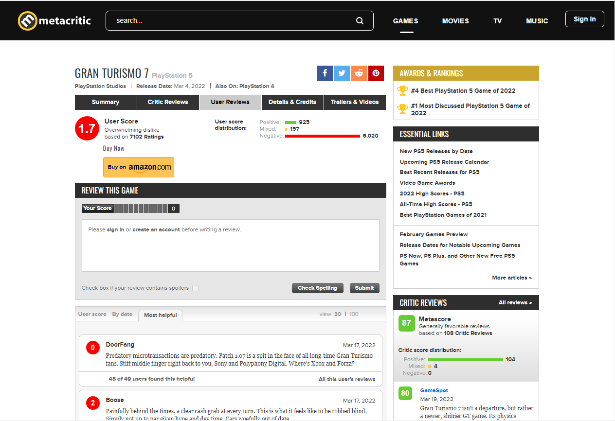 服务器中断,再加上不受欢迎的比赛收入改动,让《GT赛车7》迅速成为Mc站上PlayStation发布的游戏中,玩家评分最低的游戏。在周六时,该游戏的玩家评分已经跌到2.5分。之后更是进一步下降到1.87分。