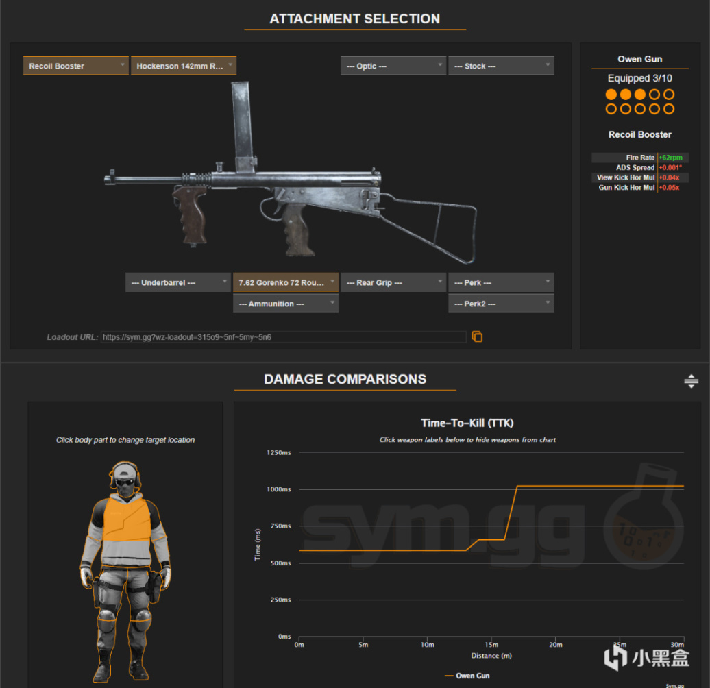 18的Owengun,在满甲满血的状态下,凭借本身的高伤害,然后通过枪口强化器+7.62子弹+射速枪管,将TTK压缩到了584ms,当之无愧的版本之子。