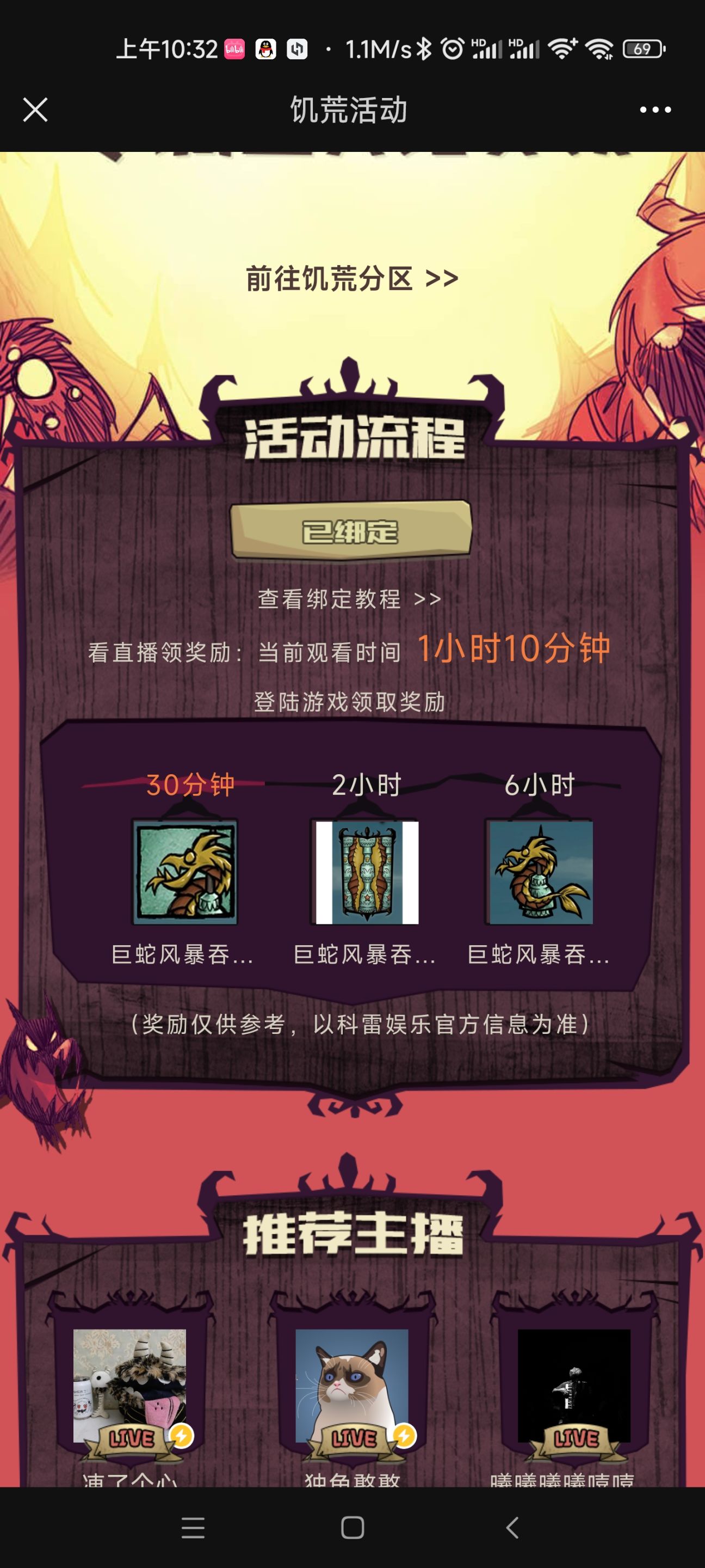 6、进入哔哩哔哩app(斗鱼同理),搜索饥荒联机版,进入前几个直播间,截屏扫直播画面上的二维码,在活动中绑定自己的账户(可以查看观看时长)