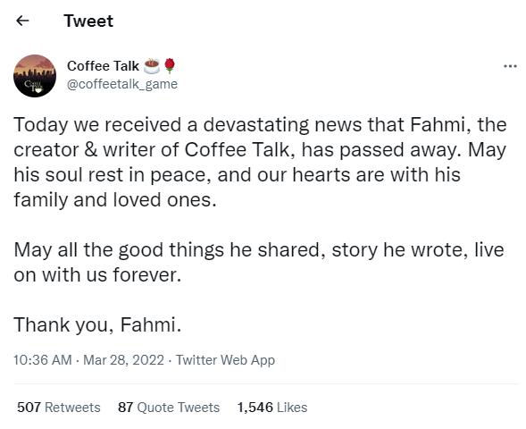 今天,独立游戏《解忧咖啡馆(Coffee Talk)》和《爱过之后EP(Afterlove EP)》的制作人Mohammad Fahmi不幸去世。