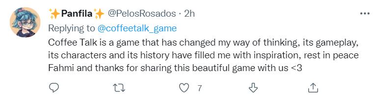 而很多粉丝也在推特上留言悼念,粉丝Panfila表示:《解忧咖啡馆》是一款改变了他思维方式的游戏,它的玩法、它的角色和它的历史带给了他无数的启迪,愿Fahmi安息,感谢你与我们分享了这个美丽的游戏。