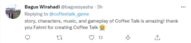 Bagus Wirahadi表示《解忧咖啡馆》的故事、角色、音乐和玩法都是非常棒的!感谢Fahmi创造出了这款游戏(哭泣)。
