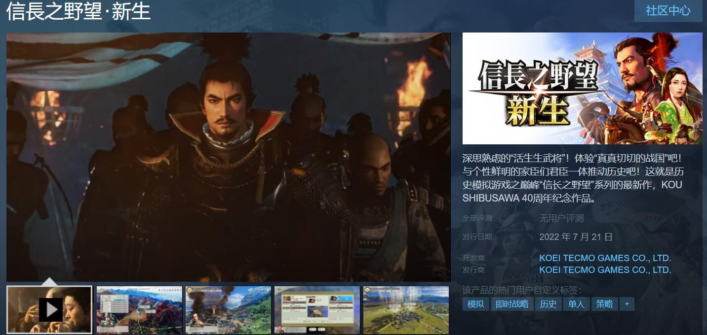 光荣特库摩新游戏《信长之野望:新生》现在已正式上架了PC Steam平台,本作预计将于7月21日发售,支持简繁中文,游戏售价和配置要求暂未公开。感兴趣的朋友可以点此将它添加到愿望单中。