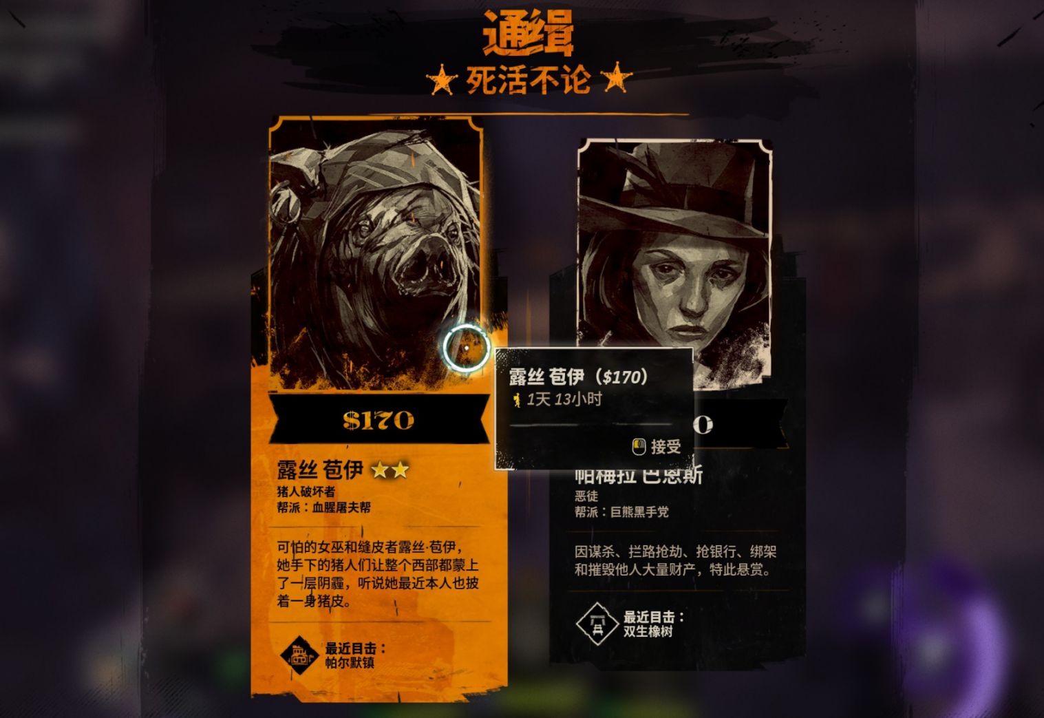 此外,当上代主角完成故事,隐居山林的时候,你会发现,以前没有机会干掉的反派头子,在你玩下一代主角的时候,会被治安官挂起悬赏,金额丰富程度让人汗颜,死活不论就是对你最大的支持与关心!你当然不能放过那些老小子,必须血债血偿!