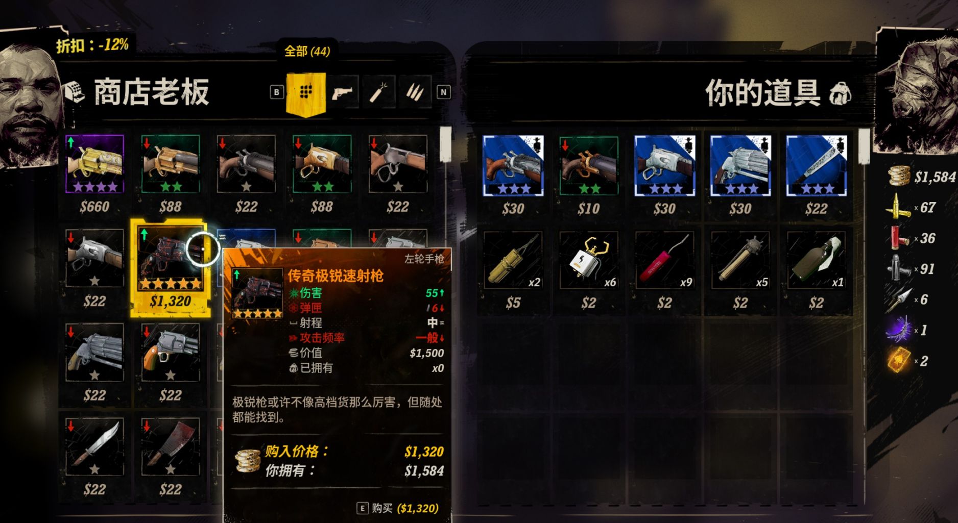 其次来谈武器升级系统,这一方面着实让人感到无奈。游戏中的装备按颜色等级分类好坏,从低到高依次是白、绿、蓝、紫、橙。武器升级的途径只有锻造一途,用铜块、银块、金块对应升级。但随着时间的推移你会发现,有时间去挖矿,收集这些材料,倒不如多做几次悬赏任务,把手里的矿产全部变卖成现钱。捧着一千多块大洋直接跑到枪械店买上一把橙色左轮的感觉,可比辛苦攒材料爽多了。