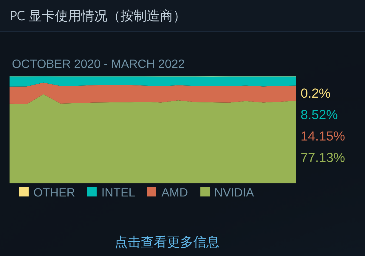 同时,使用英伟达显卡的用户比例达到77.13%,而AMD显卡用户则占比14.15%。