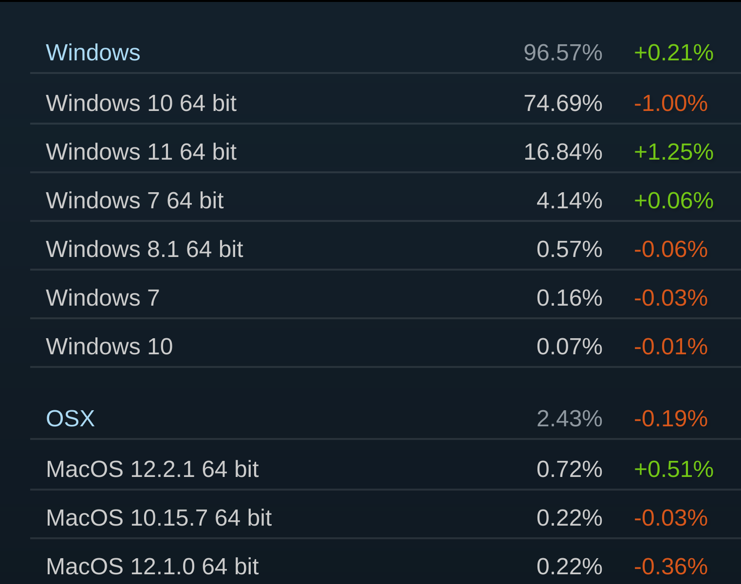 PC操作系统方面,使用Windows操作系统的玩家占总数的96.57%,这其中Windows 10 64 bit以74.69%的占比率高居第一,较上月降低1.00%,后续排名依次为Windows 11 64 bit(16.84%)、Windows 7 64 bit(4.14%)、Windows 8.1 64 bit(0.57%)。而使用OSX的玩家则依然占比较少,仅为2.43%。