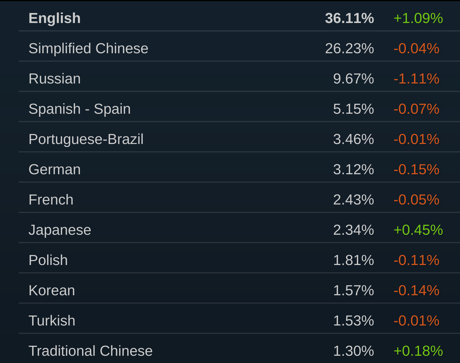 最后是Steam玩家使用语言方面,英语、简体中文、俄罗斯语占据前三,其中英语用户占比36.11%,较上月增长1.09%。简体中文用户排名第二,占比26.23%。俄罗斯语用户排名第三,占比9.67%。
