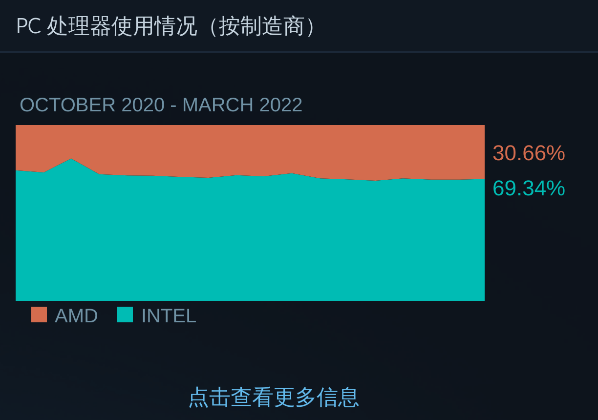 从PC处理器情况来看,使用英特尔处理器的用户仍然占据主流,占比达到69.34%,较上月增长0.59%,使用AMD处理器的用户占比为30.66%。