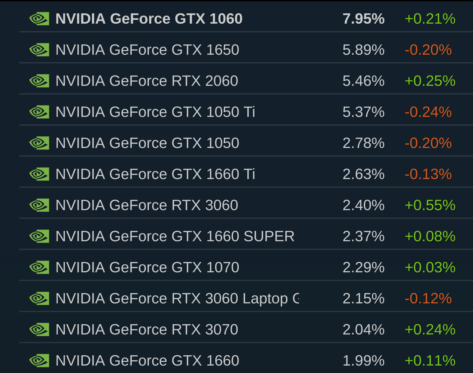 后续显卡占比排名依次为GTX 1650(5.89%)、RTX 2060(5.46%)、GTX 1050 Ti(5.37%)、GTX 1050(2.78%)、GTX 1660 Ti(2.63%)、RTX 3060(2.40%)、GTX 1660 SUPER(2.37%)。
