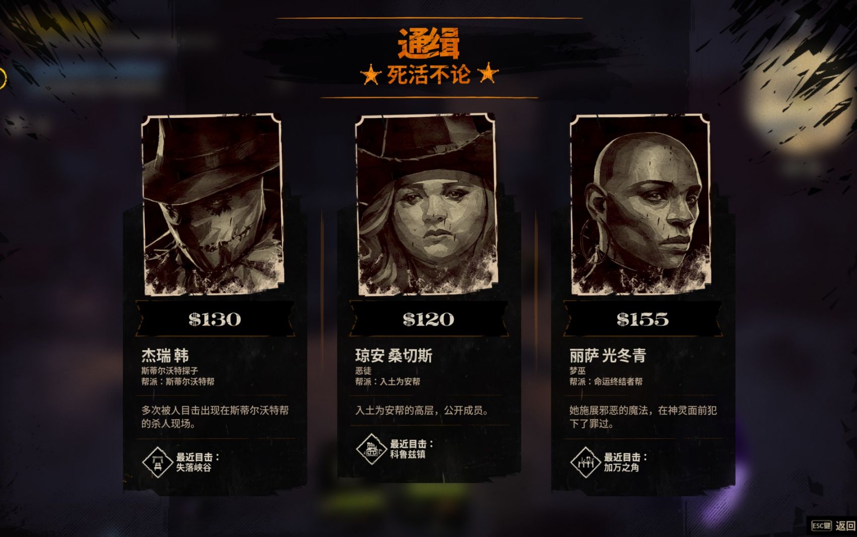 在赏金猎人篇中,我们可以杀死警长朋友,也可以杀死自己要救的丈夫,每一个选择都将改变故事的导向。当然,屠杀无辜之人也会面对惩罚。屠杀、抢劫、偷窃等都会降低荣誉值。随着荣誉值的降低,我们会登上通缉榜,进入城镇会被警长逮捕,花钱才能释放出来;在野外会被赏金猎人追杀,甚至会面对死者的亲友复仇。除此之外,如果你的同伴不认同你的行为,也会离开。