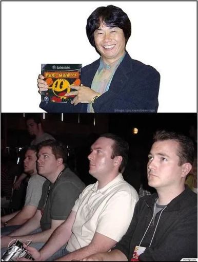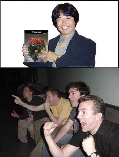 现在玩家们经常流传的四老外梗图,就来源于四位外国正在观看E3的Ign编辑,前者是四人在2003年E3任天堂发布会上,看到吃豆人新作的表情,后者则是2004年E3任天堂发布会上,他们看到《塞尔达传说:黄昏公主》的表情。