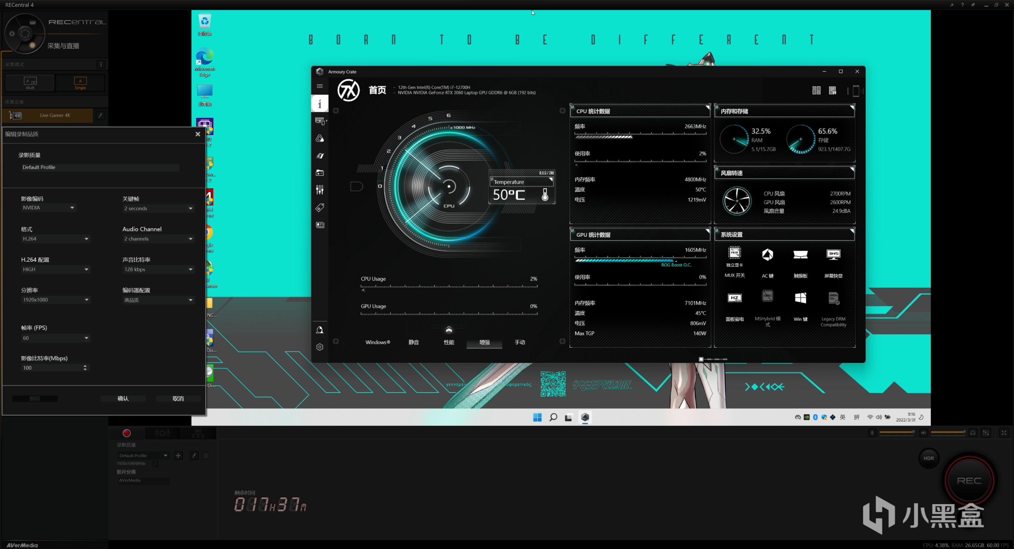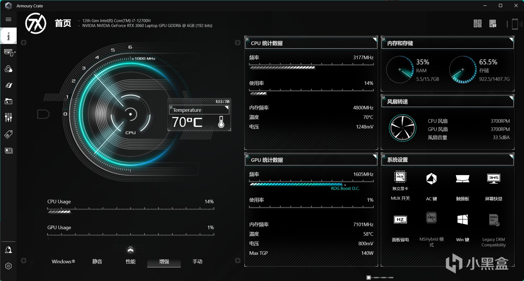 天选3的Armoury Crate软件截图,机器的各种参数都可以在这里调节,对于性能玩家来说,最重要还是模式选择和独显MUX开关(也就是通俗独显直连)。