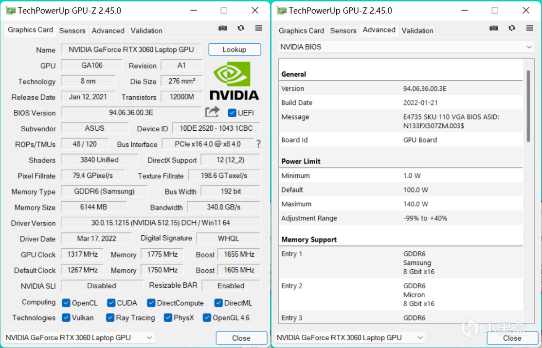 RTX 3060 Laptop移动端GPU-Z参数,对比桌面端RTX 3060其实是不相伯仲,RTX 3060 Laptop拥有更多的CUDA数量达到3840(桌面端只有3584),通俗地说就是渲染性能更强(比如某些利用CUDA加速的软件),但是它的显存仅仅是采用6GB GDDR6,所以在2K分辨率某些游戏中存在显存被爆的情况,至于Boost频率标称是1655Mhz,实际运行频率因为最高功耗上限能达到140W,要视乎游戏的优化不同,会浮动在1.7到2.0Ghz之间。