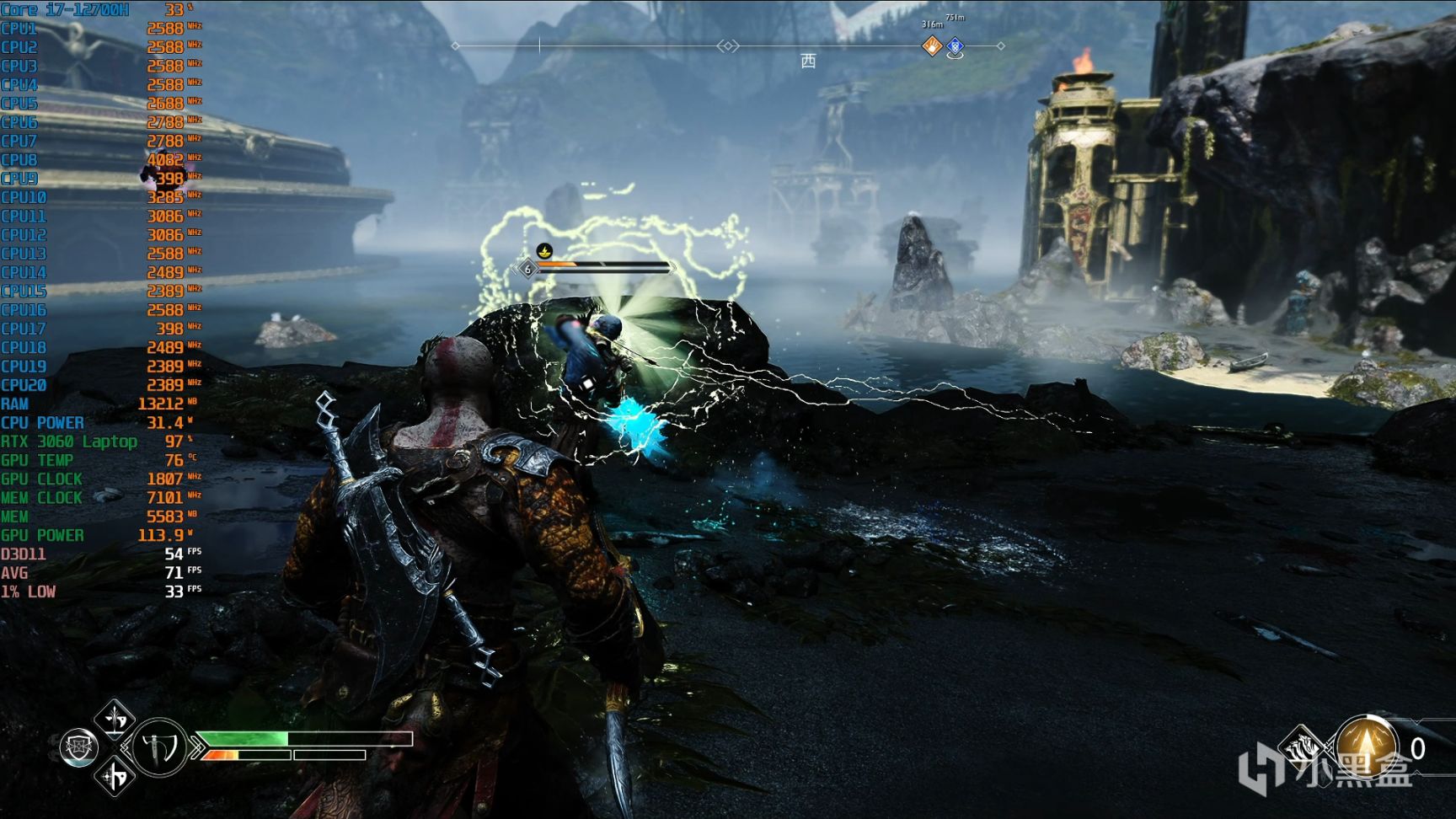 《战神4》移植过来PC平台,最大的优势就是拥有DLSS和FSR技术可用,使用DLSS质量后满足平均60帧以上,某些特效触发后会跌至50来帧,流畅度是可以完全接受的。
