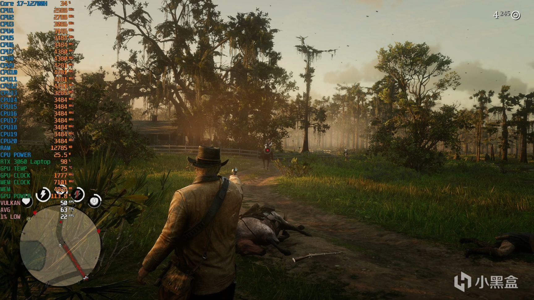 首先是画质天花板的《荒野大镖客2》,这款游戏出了名吃配置而且场景复杂,预设设置的画质6GB显存是足够了,推荐搭配DLSS质量,比快速近似和时间性抗锯齿好,大草原场景一般可以稳定60fps出头,沼泽地则是50fps左右。