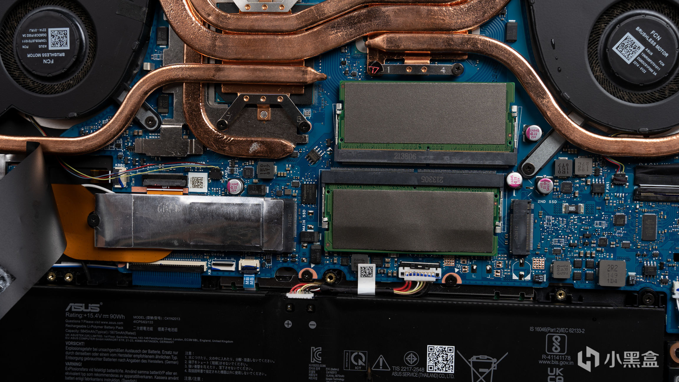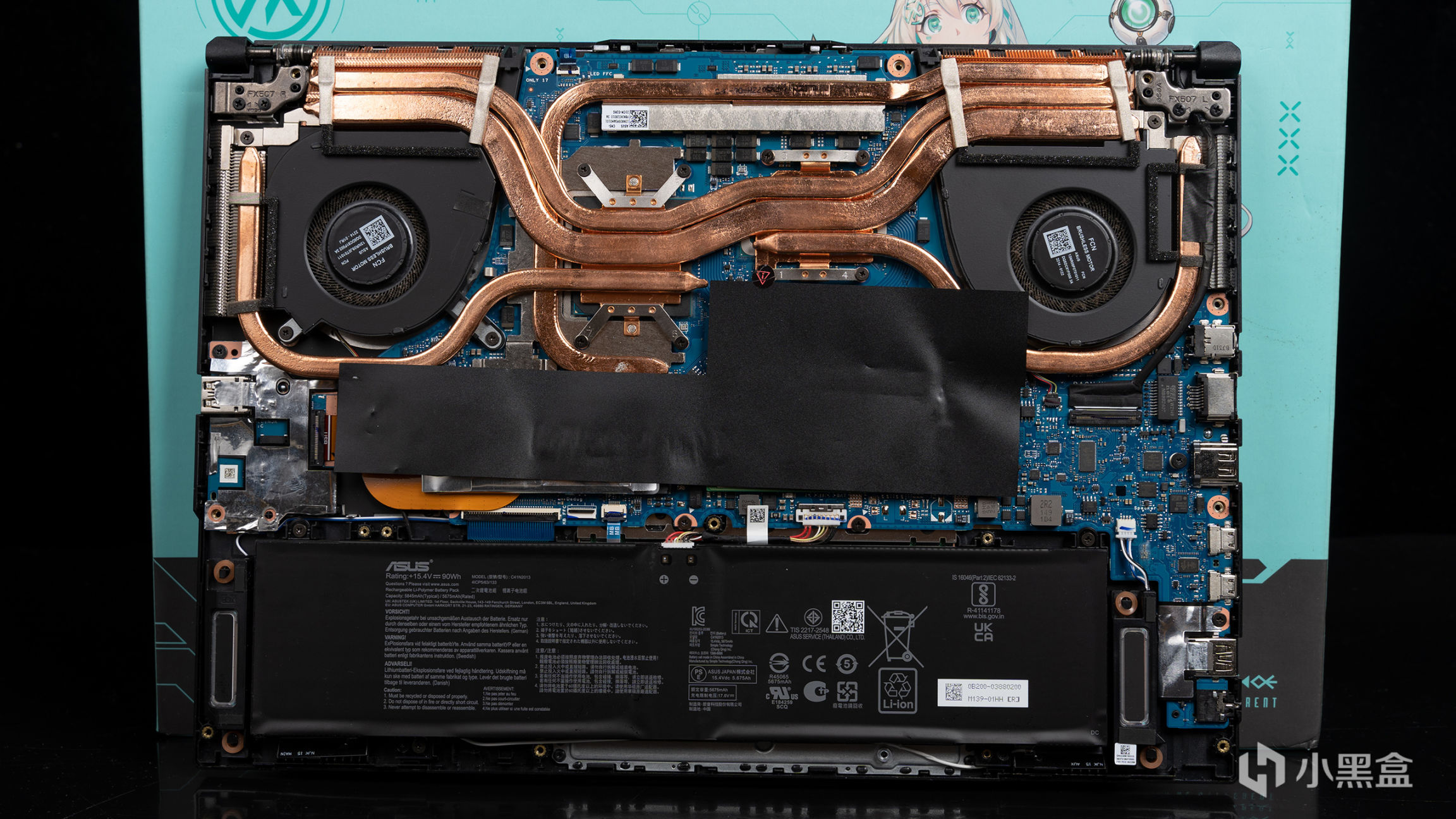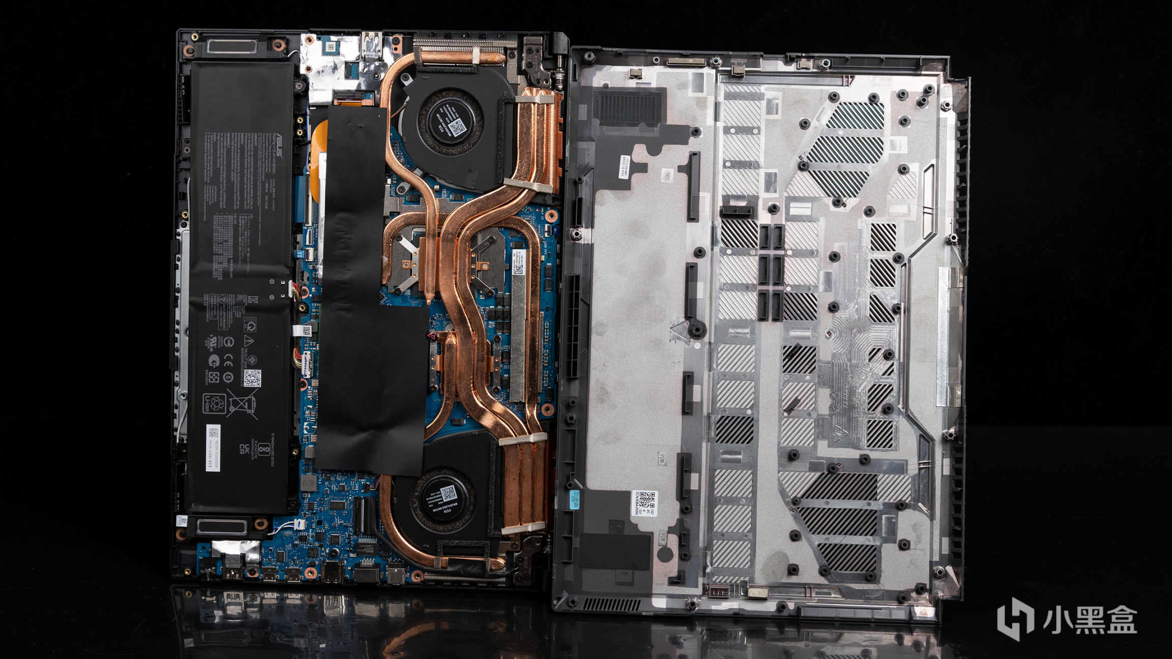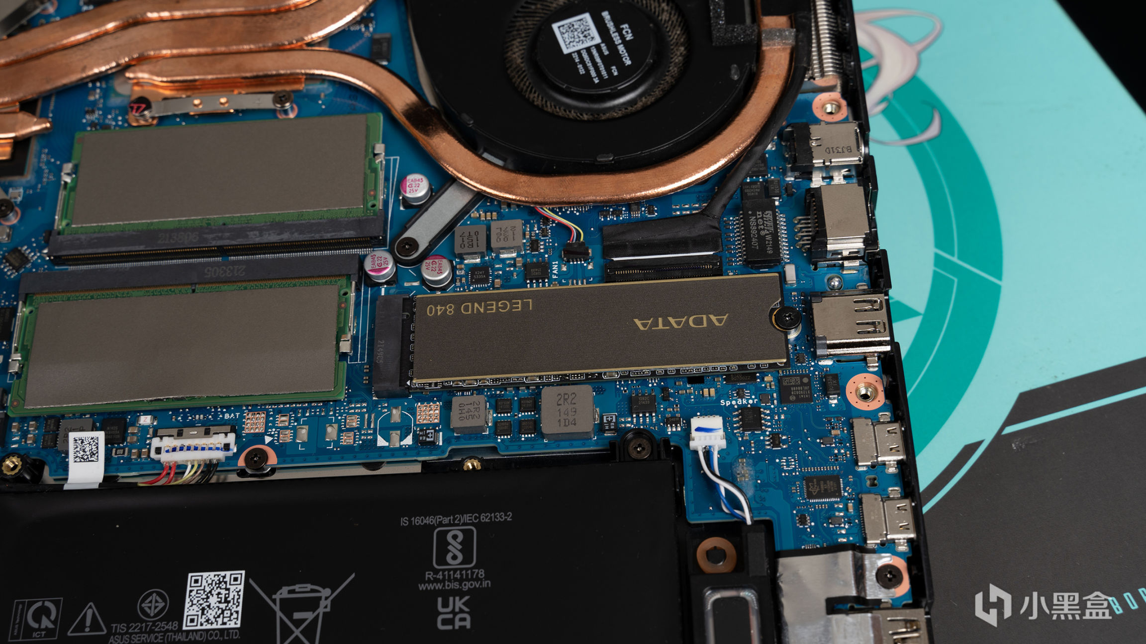 打开后盖后,就可以看到整个散热结构是双风扇+五热管的组合,其中有一根12mm的和一根8mm的同时覆盖在CPU和GPU上,而CPU和GPU额外各自覆盖一根8mm,还有一根8mm就是覆盖在CPU周围的主板原件,黑色屏蔽贴纸下就是DDR5内存和标配的PCIe 4.0 SSD。