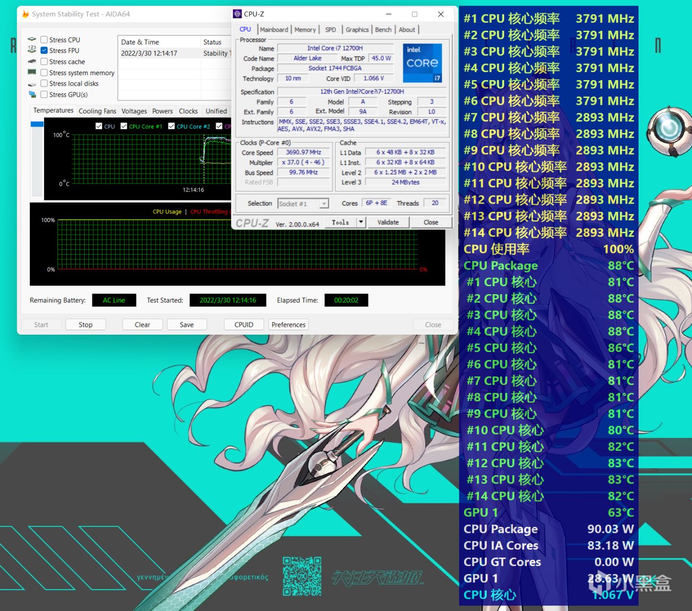 CPU单烤测试,运行20分钟AIDA64 FPU项目,i7-12700H的P核能保持3.8GHz,E核保持2.9Ghz,CPU最高温度没有超过90℃,CPU功耗在90W左右。