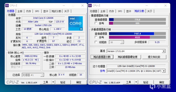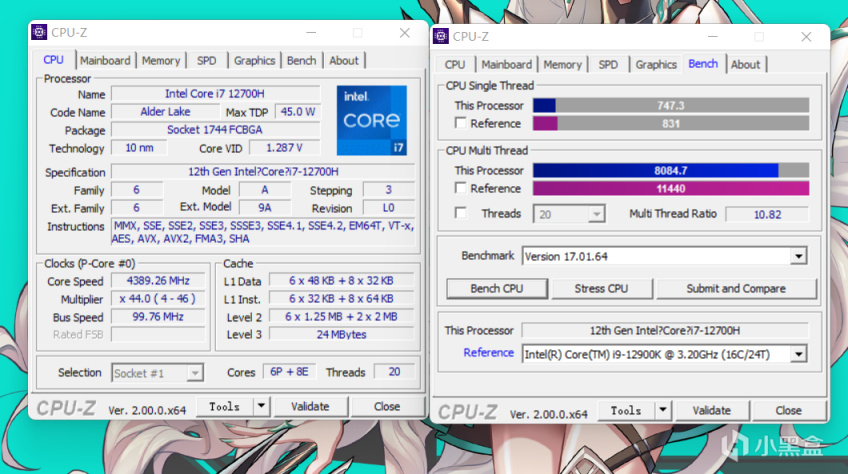 CPU-Z跑分先来试试,单核747多核8084,从分数来看,i7-12700H的理论单核性能稍微落后于i5-12600K(实际也只有3.8%的性能差距),而i7-12700H却拥有更大L3缓存达到24MB,所以两者在这游戏方面基本划等号,重点是i7-12700H拥有更多的E核心,理论多线程性能也会领先12600K达到12%左右。