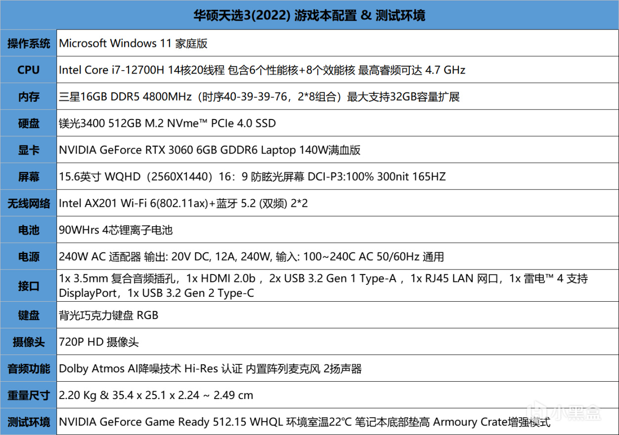 天选3还有其他方面的卖点,比如屏幕素质,这里就不一一介绍了,因为这一篇测试是以CPU和显卡性能为主,华硕天选3在游戏本中尺寸和重量算是轻量级的,毕竟只有2kg出头,但它却能让RTX 3060释放出满血的性能,而且搭载最新十二代酷睿i7-12700H处理器,也能达到i5-12600K 2000元桌面级处理器的性能水平,通过拆解也能看到,天选3的内部散热结构是有好多。而RTX 3060 Laptop配2K高刷屏是否合适这个问题,个人觉得大部分3A游戏是无压力流畅的,个别游戏适当降一下特效也无可厚非(显存容量会有一定影响),毕竟显卡本来定位就是甜点级。