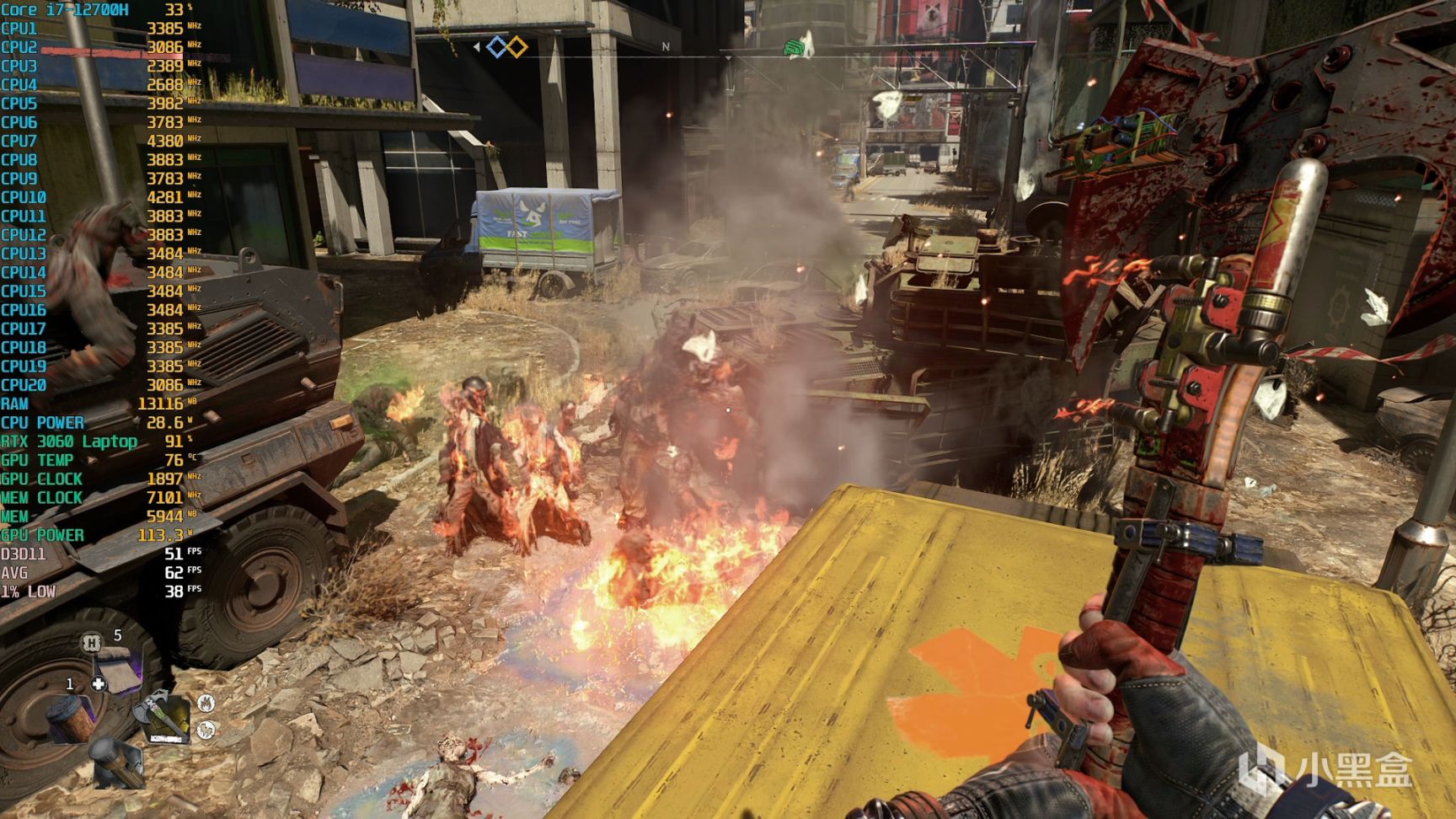 《消逝的光芒2》因为光追集成度太高,对于RTX 3060 Laptop这种甜点级就放弃吧,高质量搭配DLSS质量,2K环境6GB显存是可以基本够用的,最低帧数表现在武器特效触发的时候,大概45到50fps左右,不战斗跑酷的时候也是基本60fps。