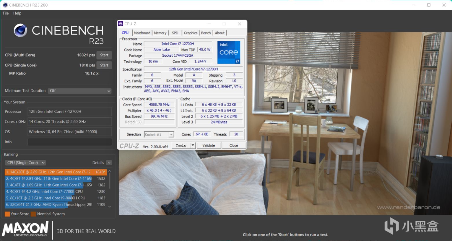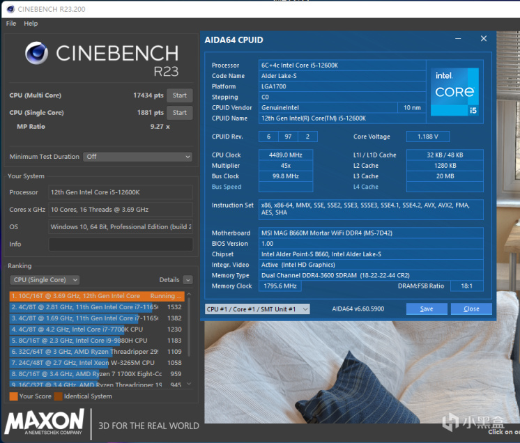 理论归理论来实践才是王道,CINEBENCH R23生产力测试,i7-12700H单核1810多核18321,i5-12600K单核1881多核17434,两者实际也是半斤八两,无非就是前者多核性能强,后者单核性能强,但是谁也来不开很大的性能差距,i7-12700H多核性能最多可以领先5%。