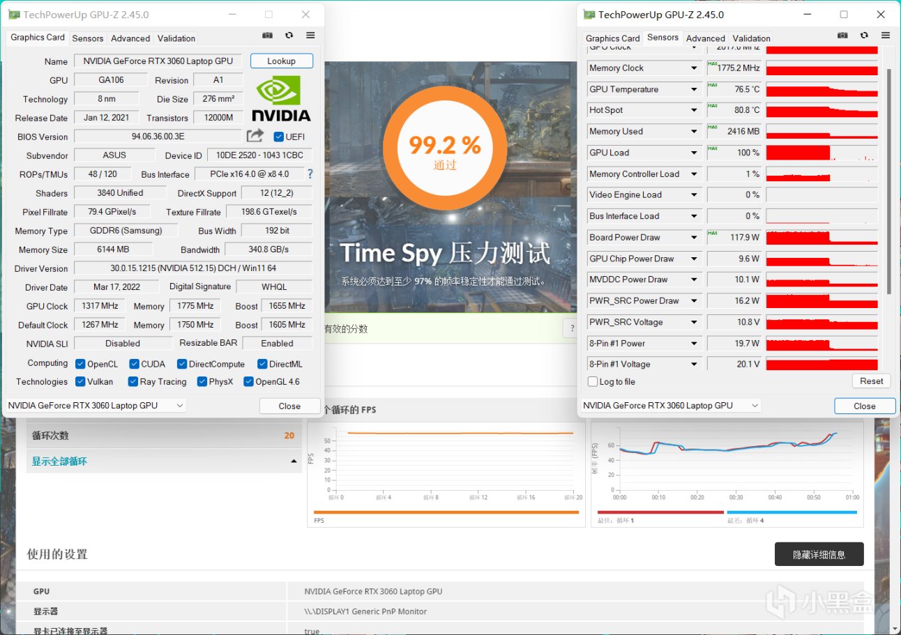 显卡单烤测试,这里选择了3DMARK Time Spy项目进行,稳定性非常不错达到99.2%通过成绩,说明显卡运行频率足够稳定,GPU核心最高温度76.5℃,功耗118W。