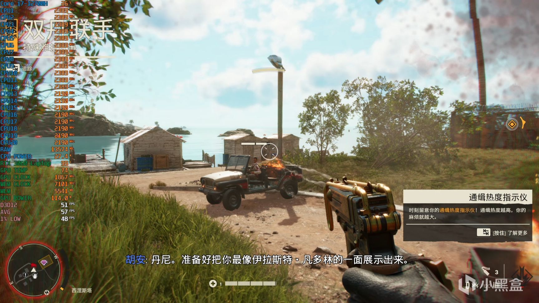 《孤岛惊魂6》作为育碧老IP,游戏优化也是非常不错的,全开画质包括光追,天选3能稳定平均接近60fps,如果想要保持60fps以上,把光追关掉或者开启FSR超高质量就能满足了。