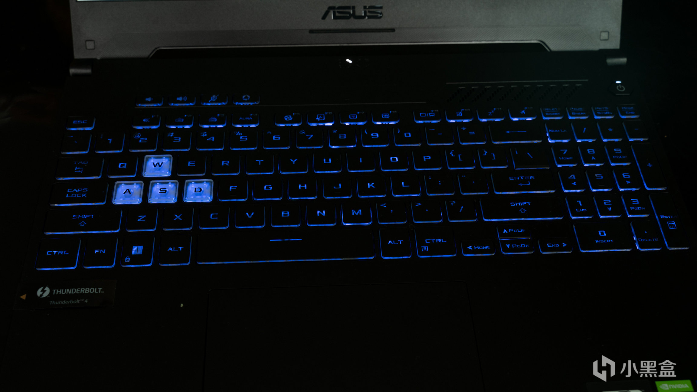 C面是全尺寸的带RGB亚克力键盘,左上角区域还有四枚快捷按键,WASD四个按键的键帽是透明处理的,全尺寸的数字小键盘对于码字的程序员来说确实不错。