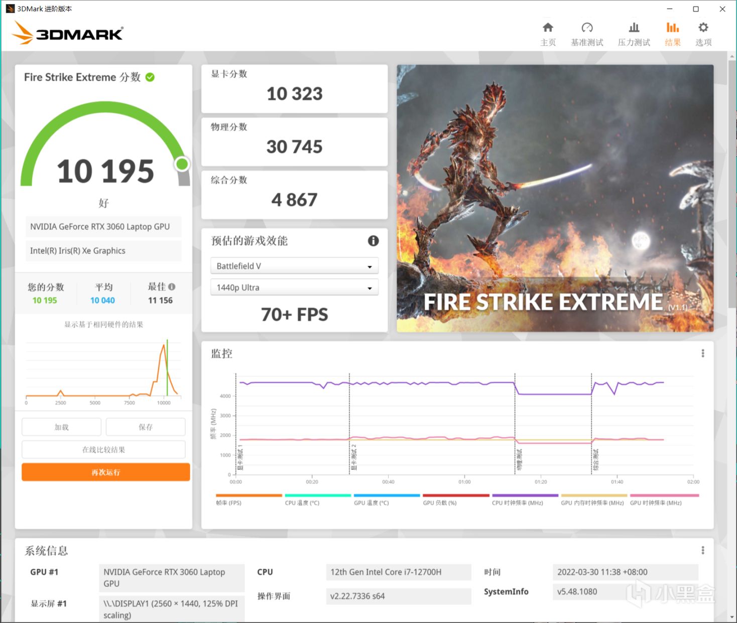 天选3 RTX 3060 Laptop Fire Strike Extreme显卡分数10323