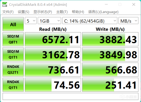 标配的SSD是一款镁光3400 512GB PCIe 4.0入门级产品,简单跑个CrystalDisk分数吧,虽然是入门级产品,但是整体性能已经超越PCIe 3.0顶级SSD,作为标配其实已经很不错,天选3还预留了一条2280长度的PCIe 4.0 M.2固态硬盘插槽,后面拆解可以看到。