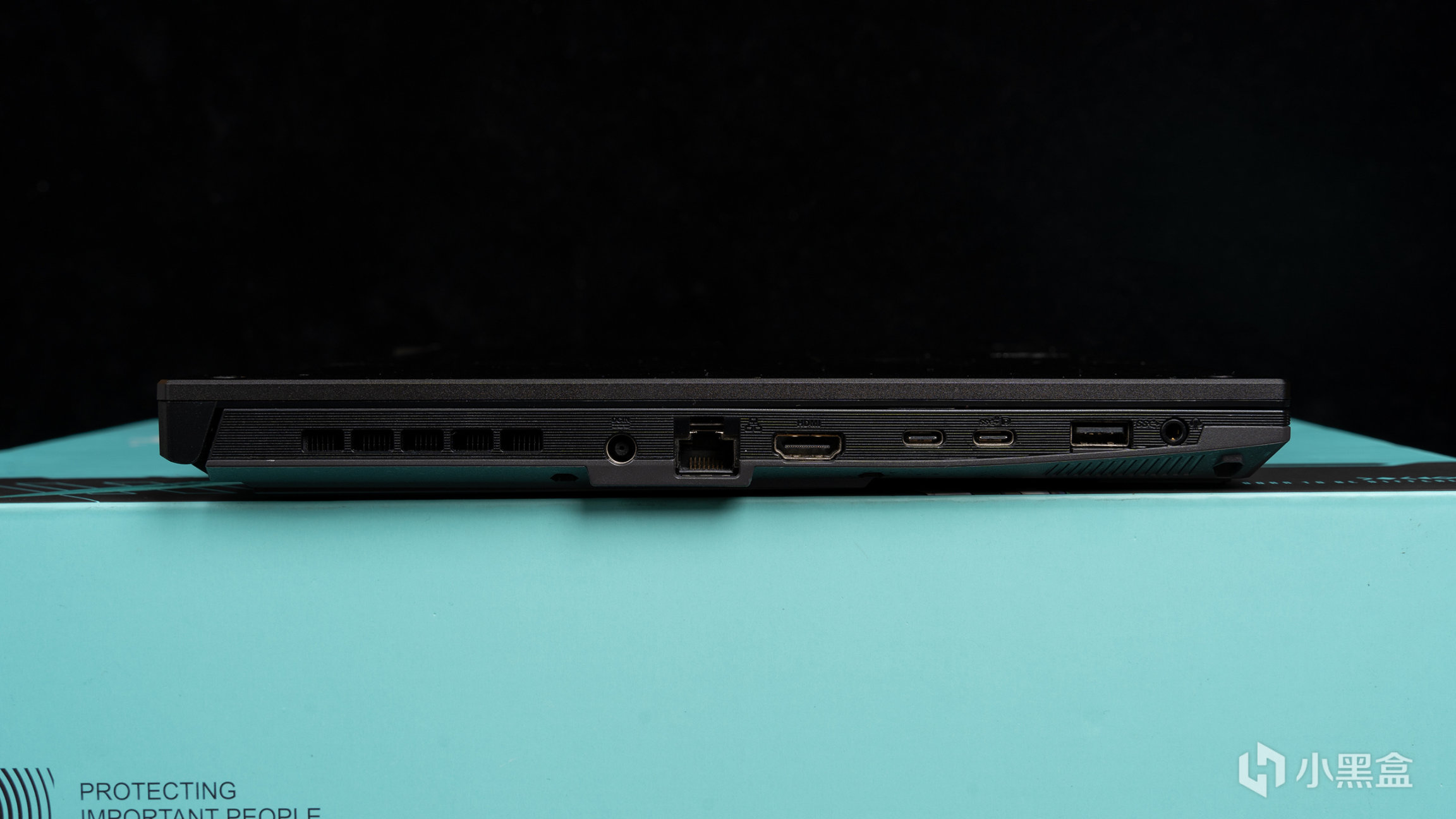 左侧区域也是散热出风口,不过栅栏面积小一点,就是上述表格那些I/O配置,分别是3.5mm 复合音频插孔、HDMI 2.0b 、USB 3.2 Gen 1 Type-A 、RJ45 LAN 网口、雷电™ 4 支持 DisplayPort以及USB 3.2 Gen 2 Type-C(同样支持 DisplayPort),接口很齐全丰富了尤其是搭载了雷电4。