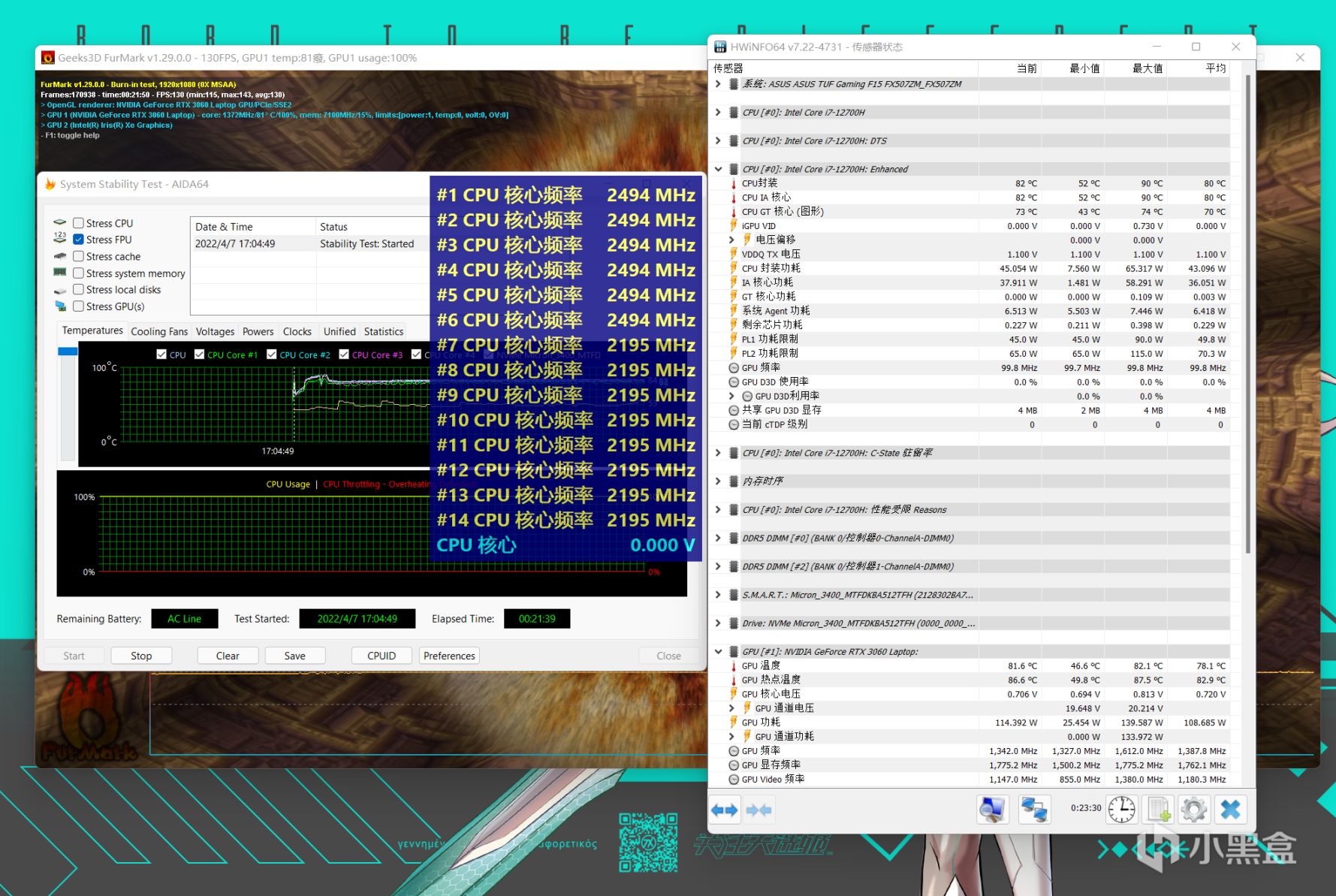 双烤测试,运行20分钟AIDA64 FPU和FurMark同时进行,i7-12700H的P核能保持2.5GHz,E核保持2.2Ghz,CPU最高温度82℃,CPU功耗45W,RTX 3060 Laptop运行核心频率1342Mhz,GPU最高温度81.6℃,GPU功耗114W,表现符合预期,毕竟天选3也只是一款2.2kg重量级的游戏本,下面是具体游戏实机性能测试,也可以参考下这款机器的温度表现。