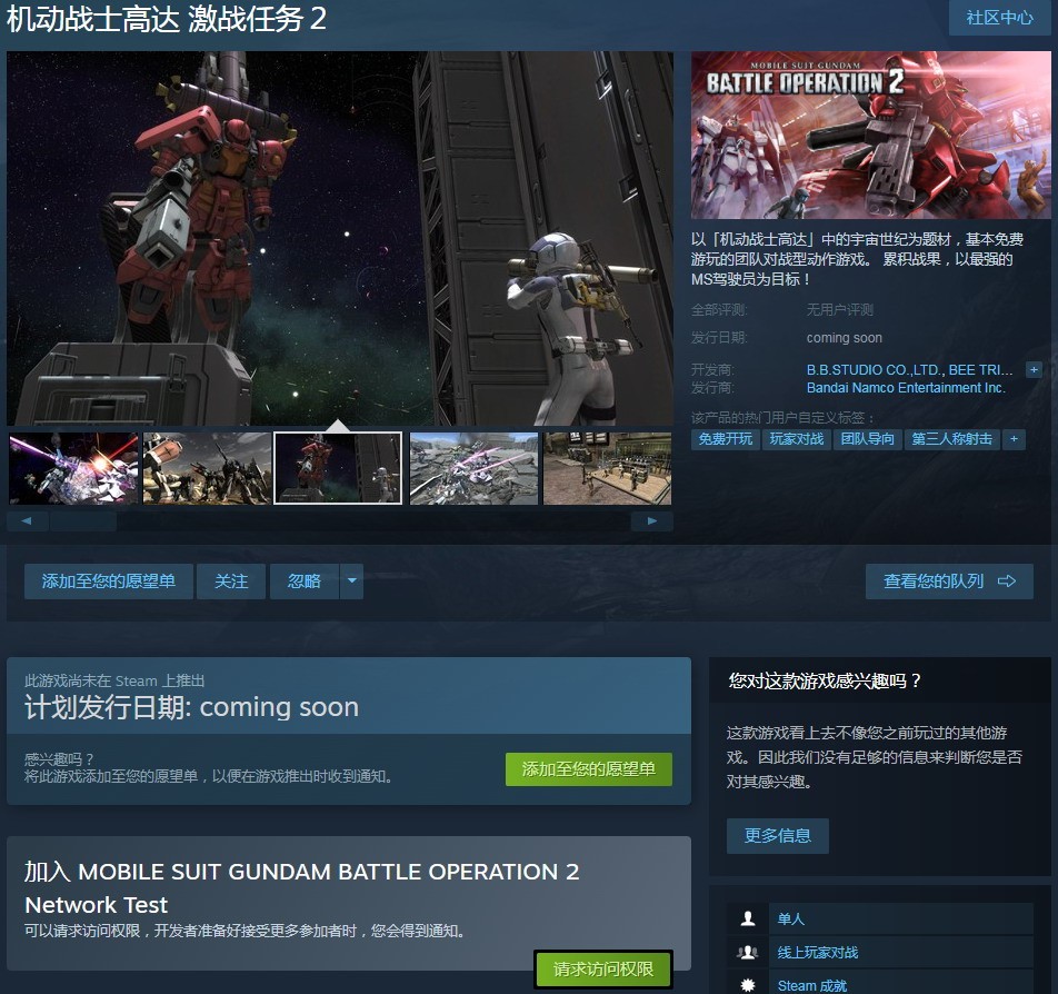 《机动战士高达:激战任务2》上架Steam 开测在即