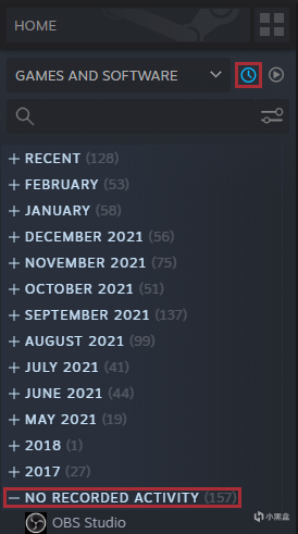在Steam客户端的库页面,根据近期活动排序(点击“钟表”符号)后,入库后未游玩的所有永久免费游戏都会在最底部“无本地记录”栏中;所有购买(包括限免期间领取)的游戏,会按照入库时间和最后游玩时间中的最大值来排序。只要不进行游戏,免费游戏就会一直沉在最底部,不存在与购买游戏穿插,影响浏览和寻找游戏的问题。