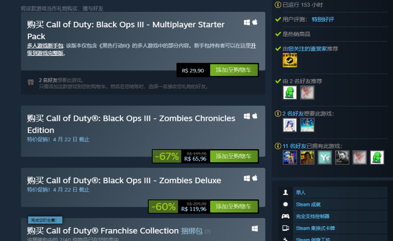最后是call of duty:black ops 3 cod12黑色行动3。千万别买第一个版本,那个多人新手包纯纯坑人,要买至少买本体啊。第二个是僵尸编年史版本,里面只有僵尸编年史,不带季票的,你买了第二个版本后还得买第三个的,所以如果玩僵尸,建议一步到位直接买第三个。