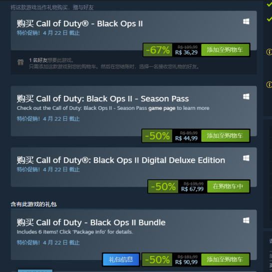 首先是call of duty:black ops2 cod9 黑色行动2,第一个就是本体了,最后一个就是全dlc大包,第二个就是季票,这都是很明显的。但是吧你会发现,它多了一个版本——Digital Deluxe Edition 数字豪华版,就很多人不知道这版本里有啥,其实这个版本里没有季票,但是多了一个ost和cod5,也就是说如果你正好也想买cod5而且不玩僵尸模式的话,买这个,划算的。顺便说一下,最贵的大包里也没有ost,动视真会赚钱。