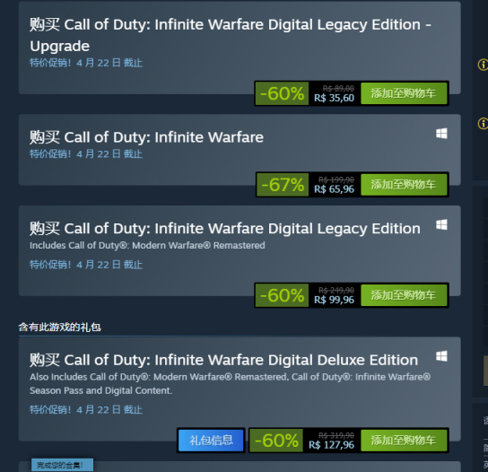 然后就是cod13 无限战争,这个说实话很多人就懵逼了,第二个看起来是游戏本体,怎么还比第一个贵?这个其实挺坑的,第一个版本是Digital Legacy Edition - Upgrade 数字遗产版升级包,这个是数字遗产版的升级包,里面只包含一个现代战争1的重置版.....千万别买。第二个就是本体,第三个就是本体+现代战争重置版,第四个就是本体+全dlc+现代战争重置版