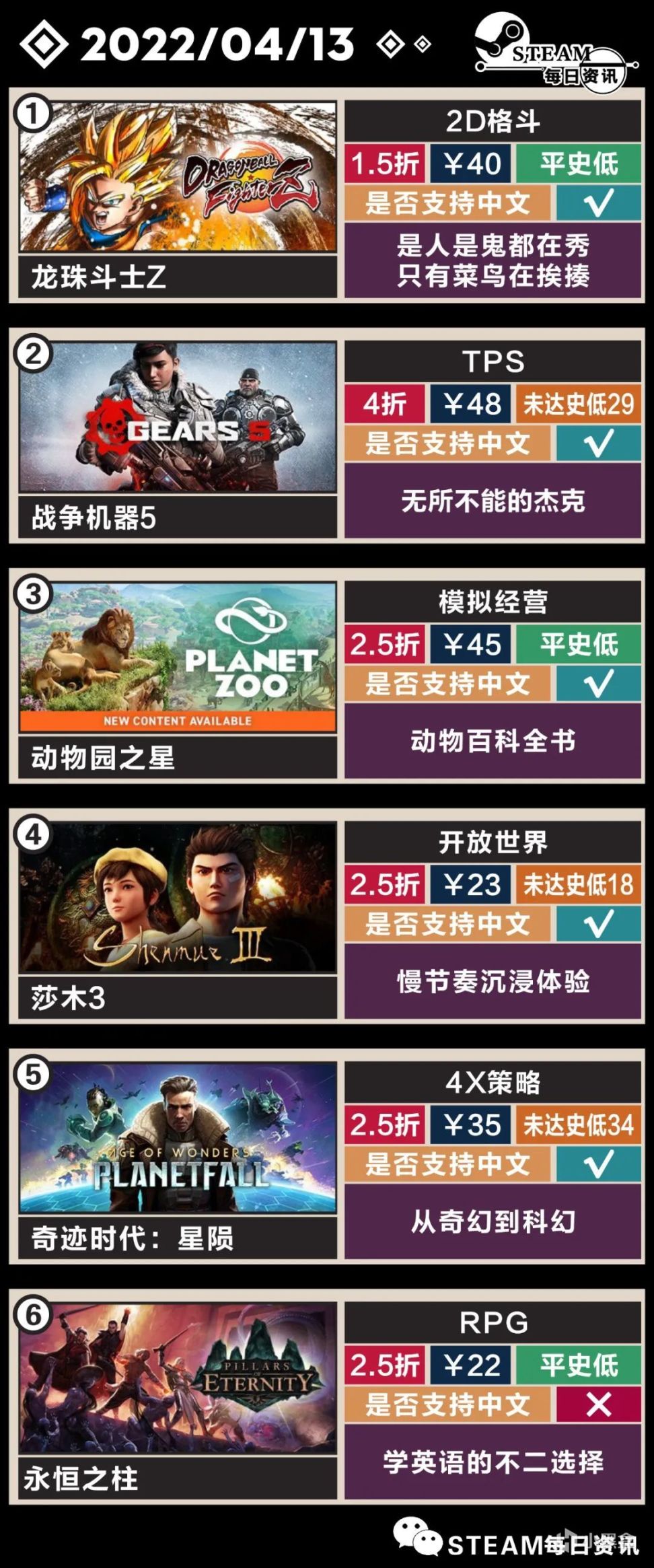 动物百科全书 - 动物园之星,模拟经营游戏,支持简体中文&中配,2.5折,售价45,平史低(首次史低时间21.12.14;最近史低时间22.1.27,近期折扣力度不一),性价比良好,促销截止4.22。