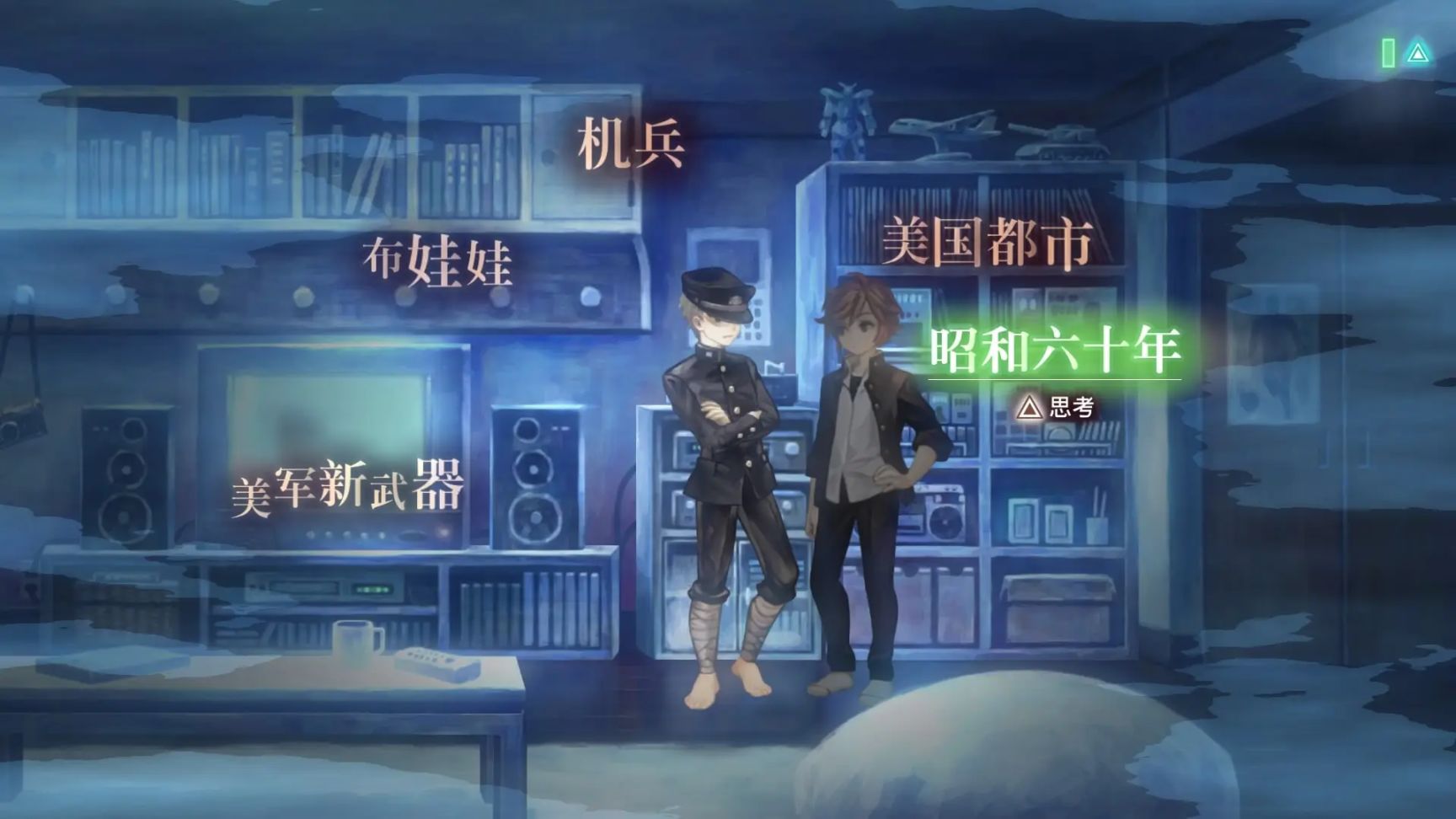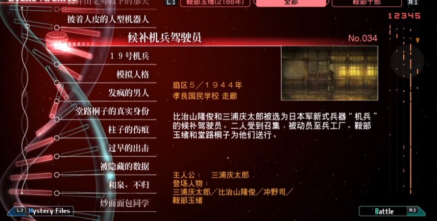 本作的游戏流程分为三个模式,分别定名为追忆篇、崩坏篇、探明篇。追忆篇是专属于剧情的模式,玩家可以选择进行任意主角的章节。本作的剧情演出并非传统AVG的对话框+插图形式,而是采用了2D横版游戏的操作模式,玩家可以控制角色在区域内自由移动,通过调查物品或与特定人物对话获得关键词。关键词可能用于主角自身思考,也可能成为与他人互动的道具从而推进剧情发展。基本上本作的剧情不容易出现卡关难点,就算进入坏结局也并不代表游戏失败,但请注意某些推进剧情的时机可能出现时间较短,如果错过互动时机导致卡关,请就近选择中转点重试一遍。