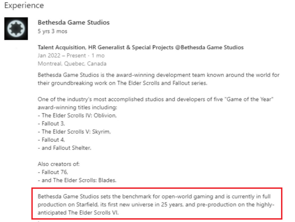 B社一位从事人才招聘工作的员工LinkedIn页面显示“B社为开放世界游戏设立了标杆,目前正在全力制作《星空》,这是其25年来的第一个新宇宙。而备受期待的《上古卷轴6》目前也处于预制作阶段。”